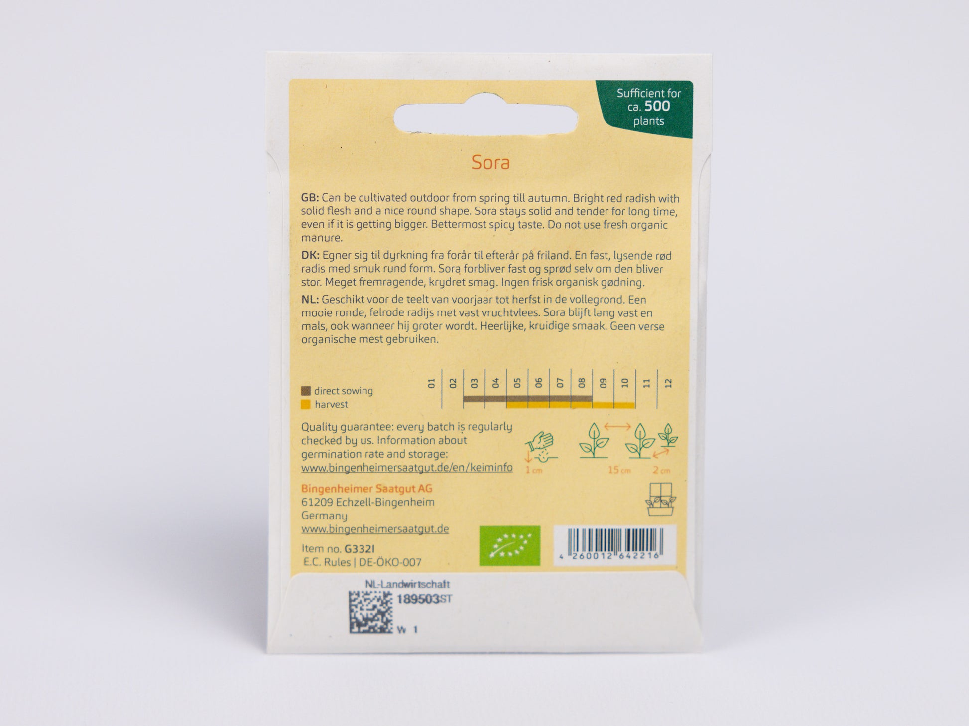 Sora Radijs : Til uw tuin naar een hoger niveau met de Sora-variëteit, een opvallende radijs die bekendstaat om zijn stevige, karmijnrode vruchtvlees en prachtige ronde vorm. Deze variëteit wordt geprezen om het behoud van zijn stevigheid en malsheid, en biedt een consistente, aangename textuur, zelfs als de radijzen groter worden. De Sora-radijs is niet alleen een lust voor het oog met zijn levendige kleur en middelgrote bladeren, maar biedt ook een geweldige pittige smaak die hem tot een favoriet maakt onder radijsliefhebbers.